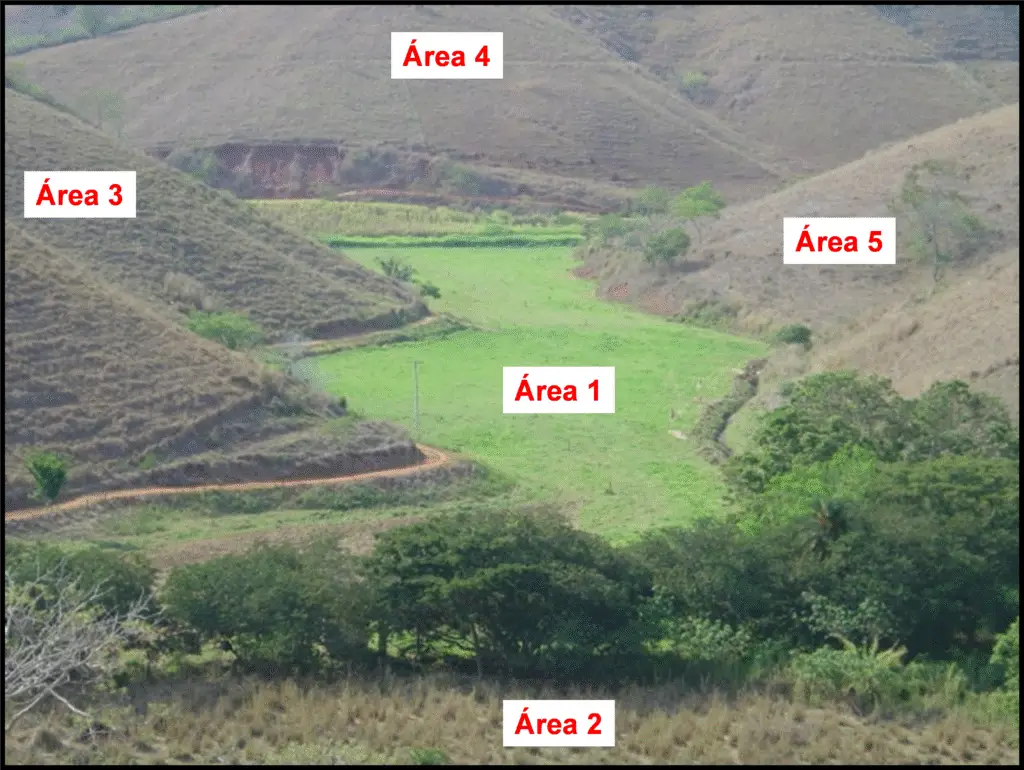 Área 1: pastagem intensiva, com capim-tanzânia adubado e irrigado; Área 2: pastagem com capim-tanzânia adubado, mas não irrigado; Área 3: pastagem com capim-braquiarão formada recentemente; Área 4: pastagem extensiva com capim-braquiarinha; Área 5: pastagem com capim-braquiarão formada há 10 anos.